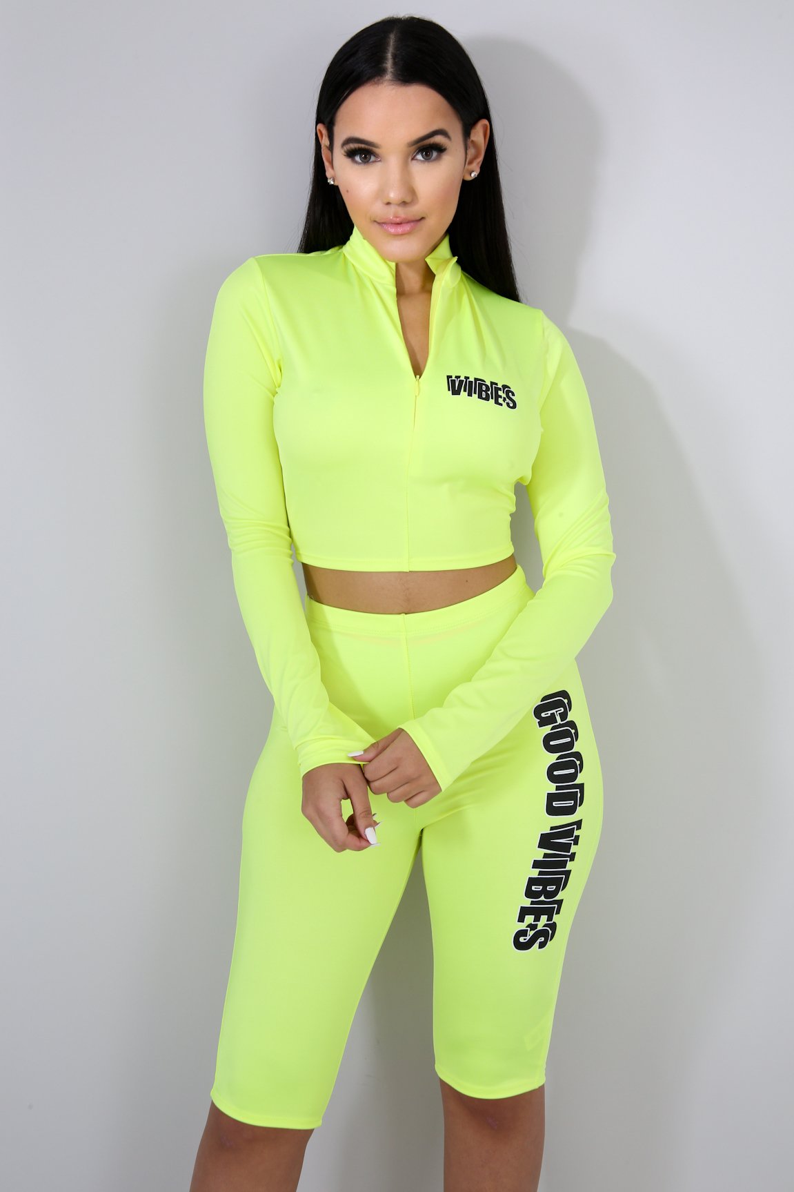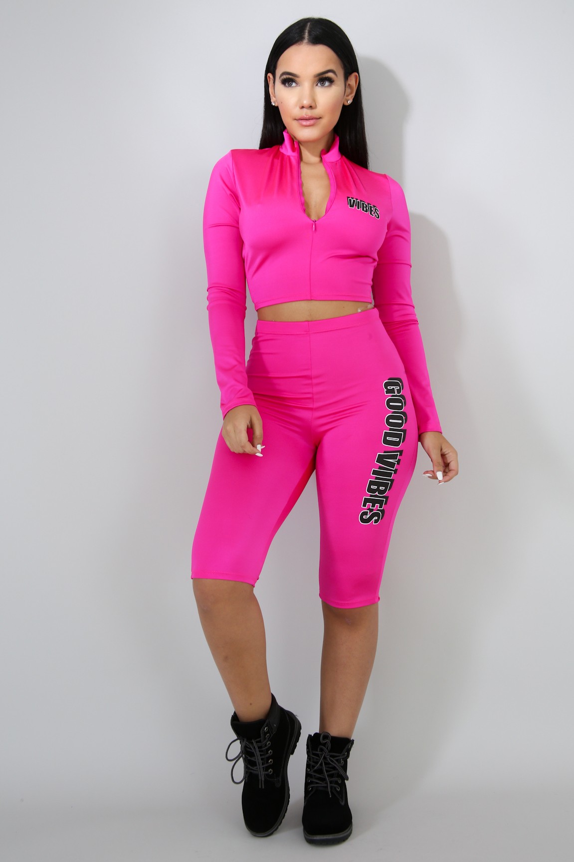 The Good Vibes Set features a stretch fabric, long sleeves, zipper detail, and an elastic waist.