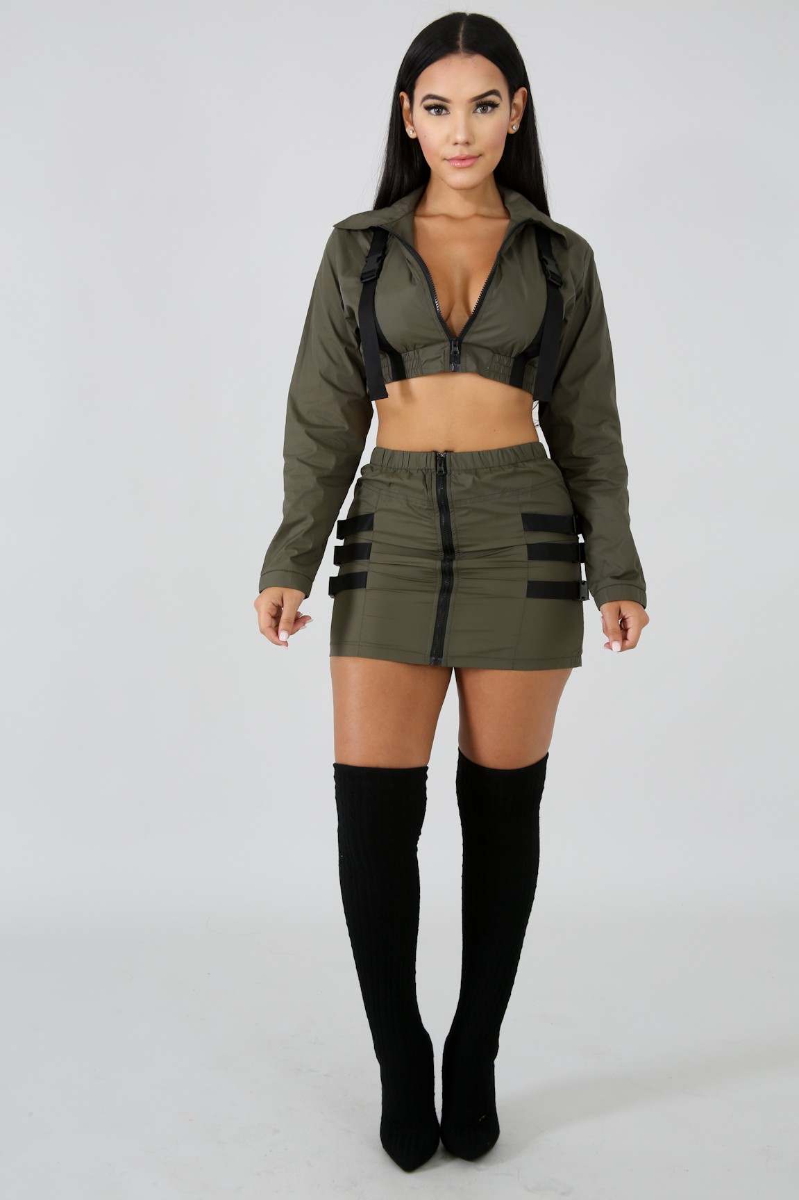 She's everything windbreaker set features, a non-stretch fabric, crop jacket, collard neckline, long sleeves, front buckle detail, front zipper closure, high waist mini skirt, underlined net, side buckle details, finished with a front zipper closure.