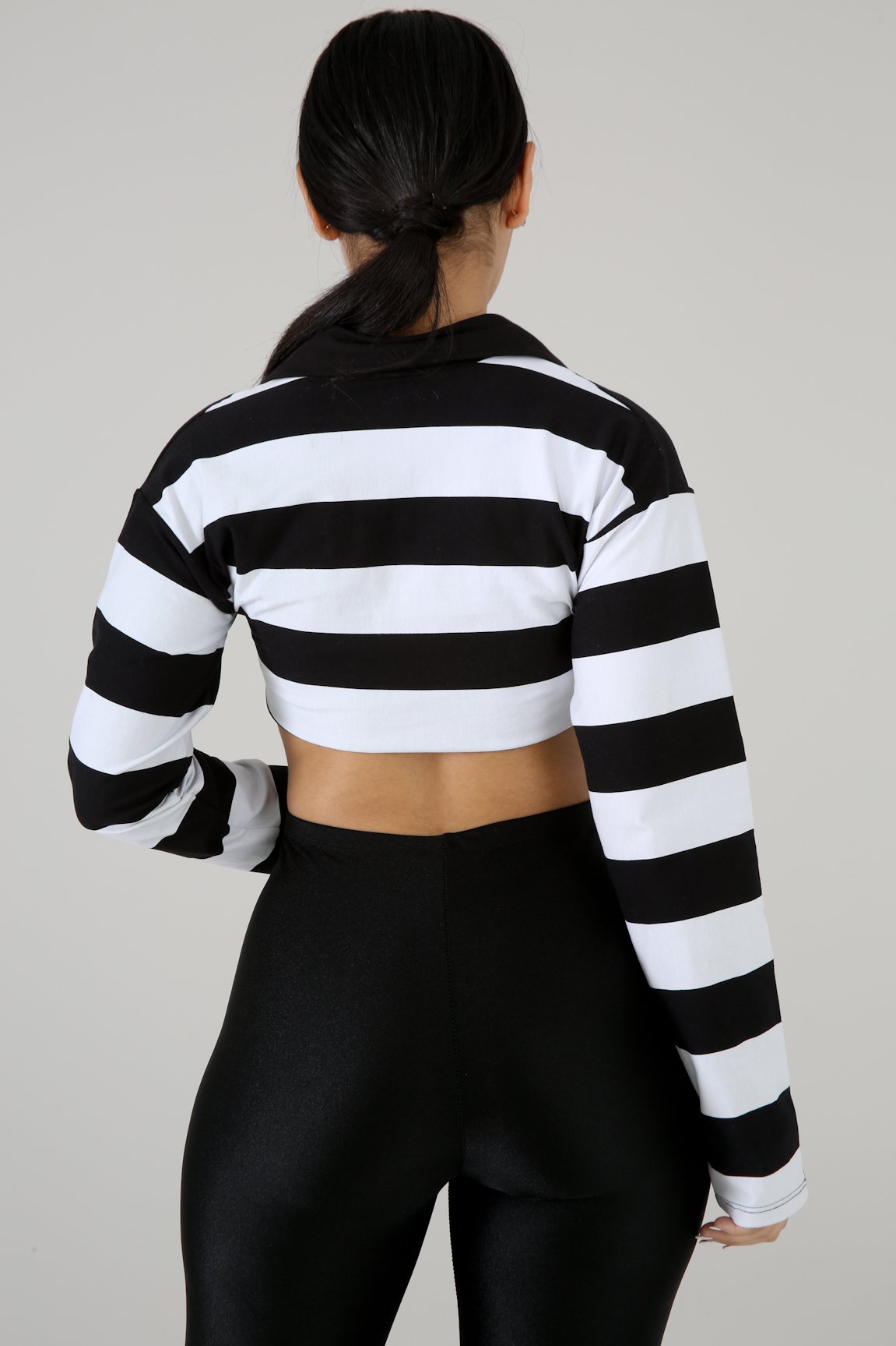 This top features a stretch fabric, cropped, long sleeves, collard, and mock v neckline.