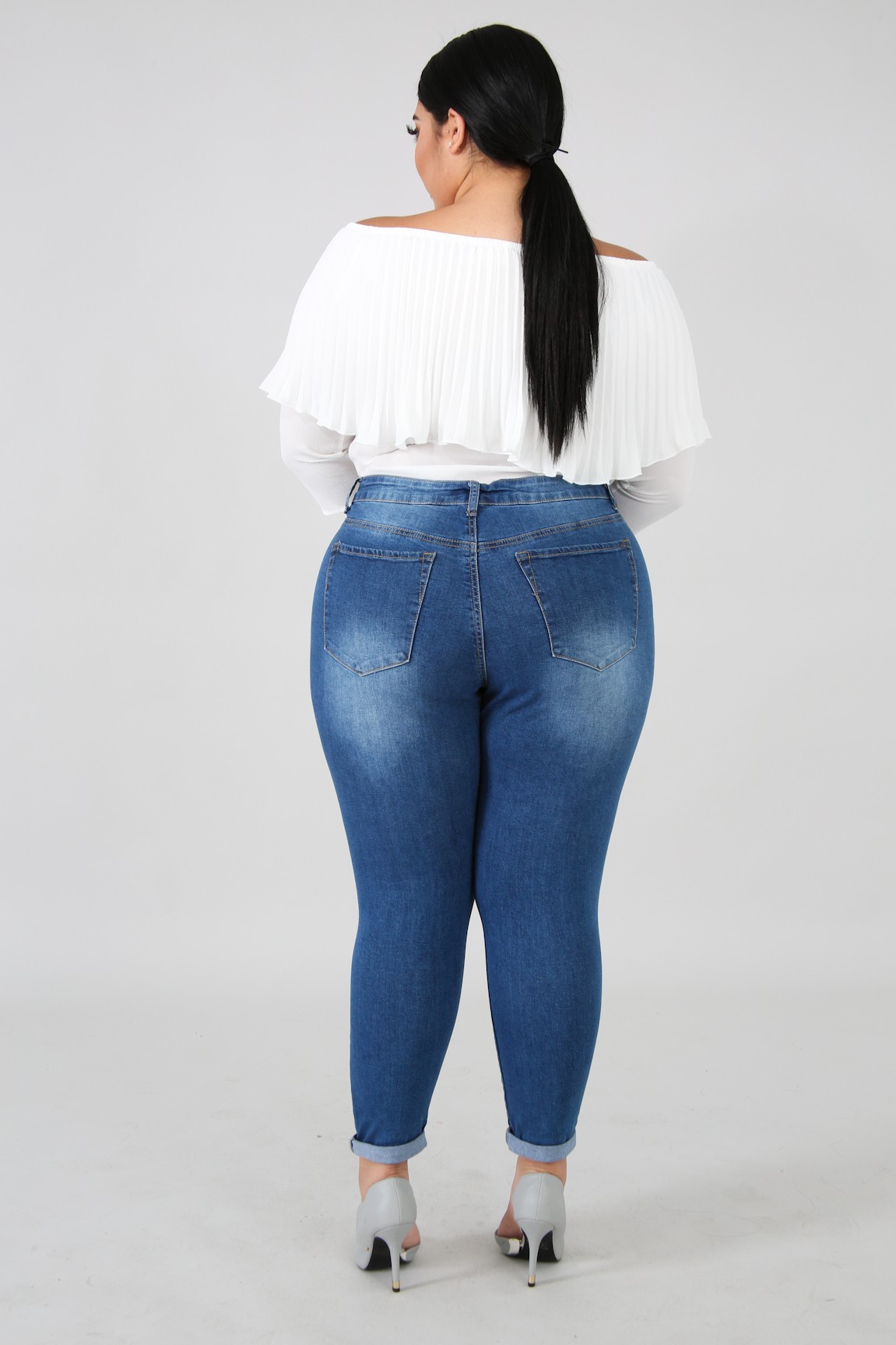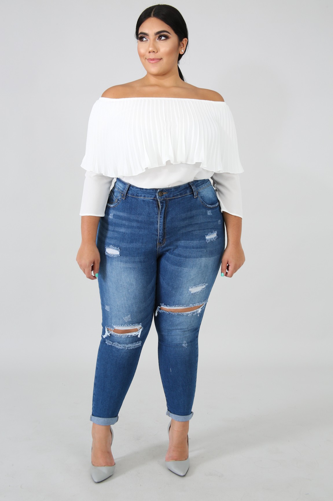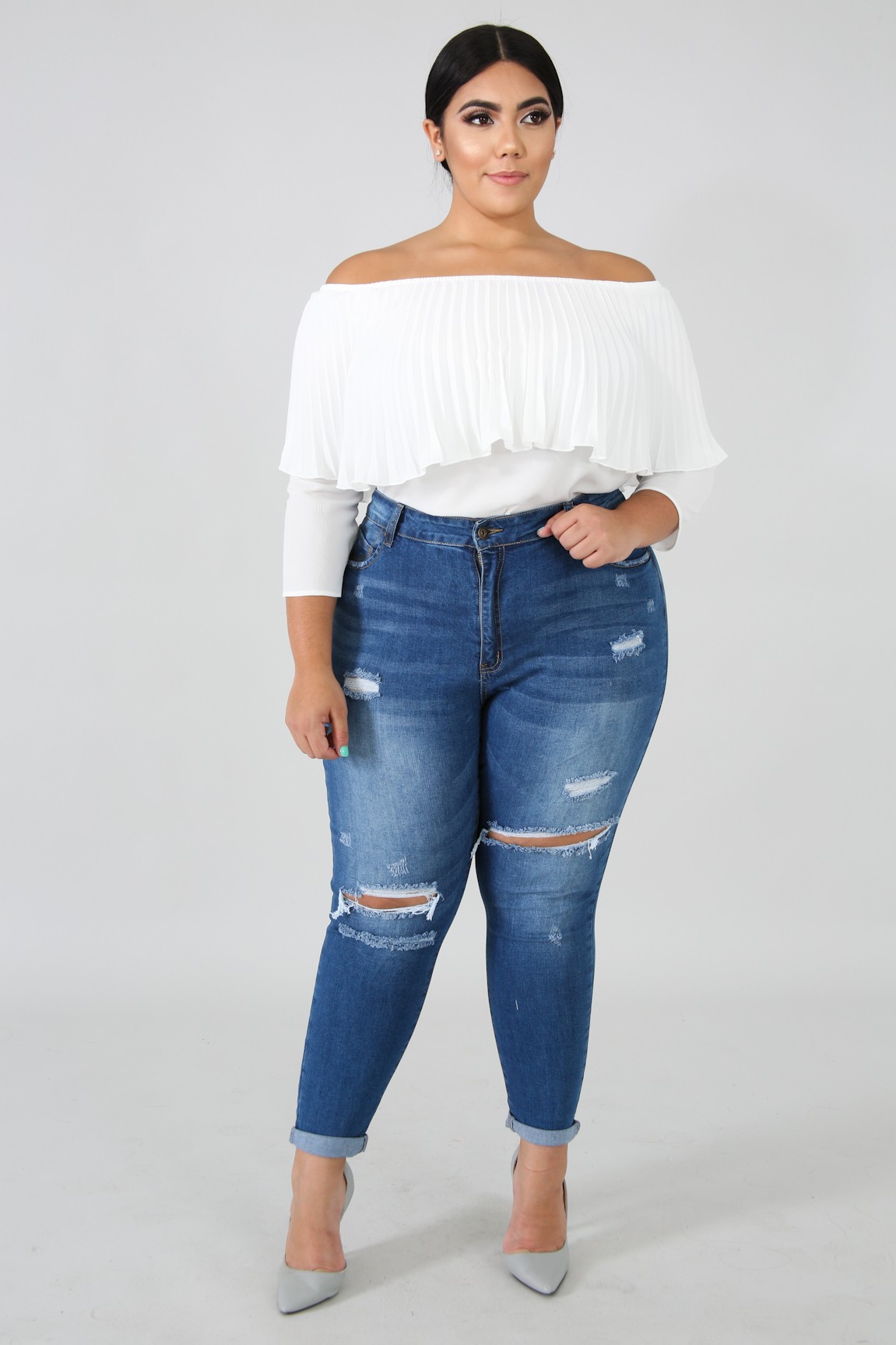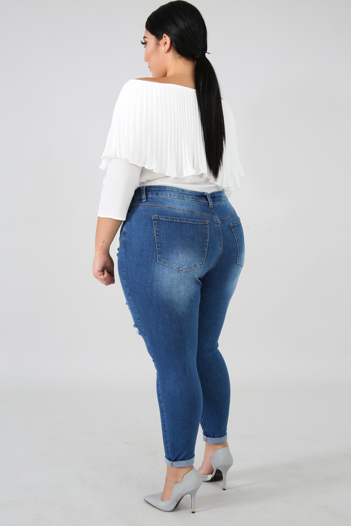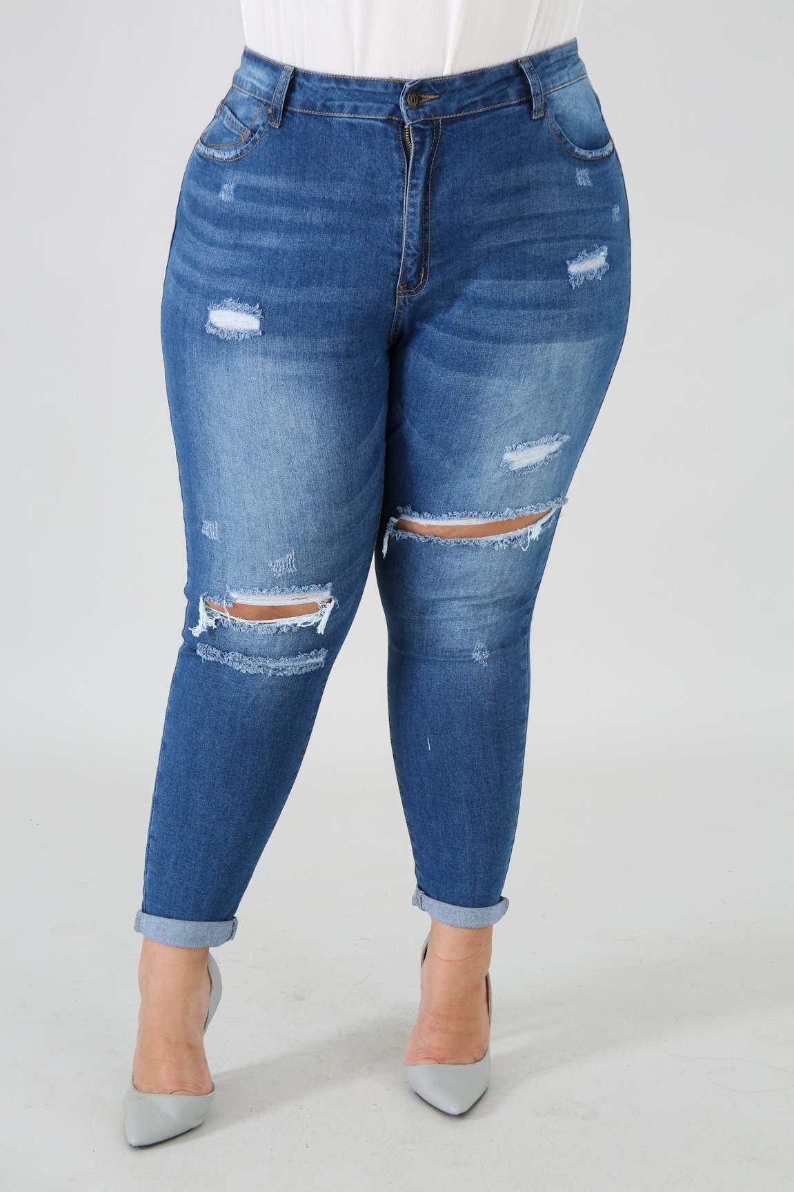 This denim skinny crop jeans features, a stretchy fabric, high waist, shredded front detail, five pockets, belt key holes, finished with a a front button and zipper fly closure.